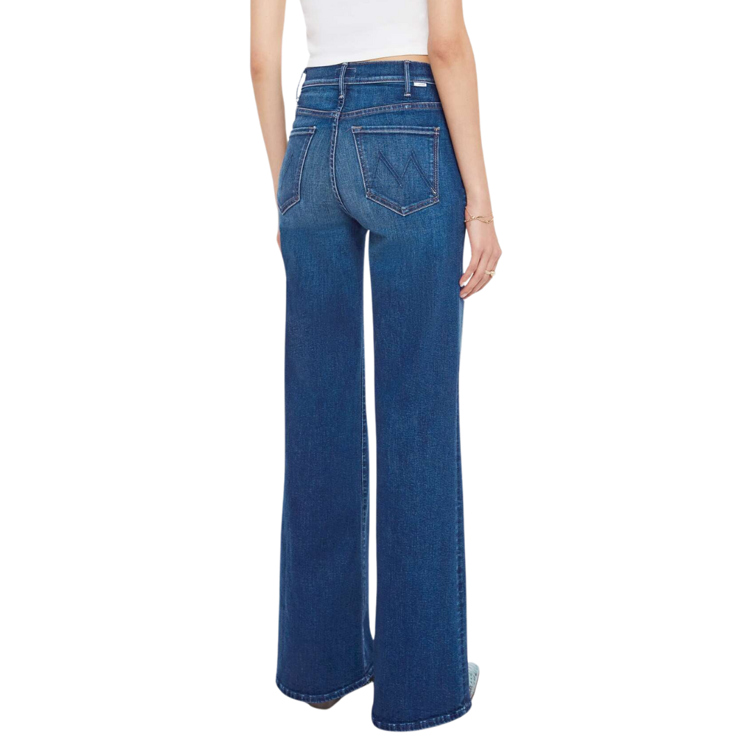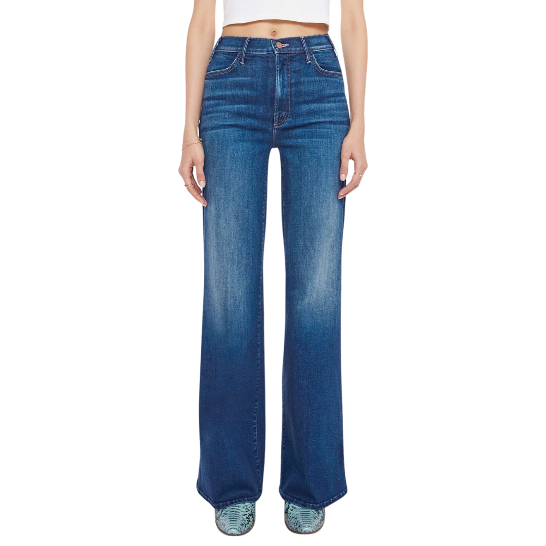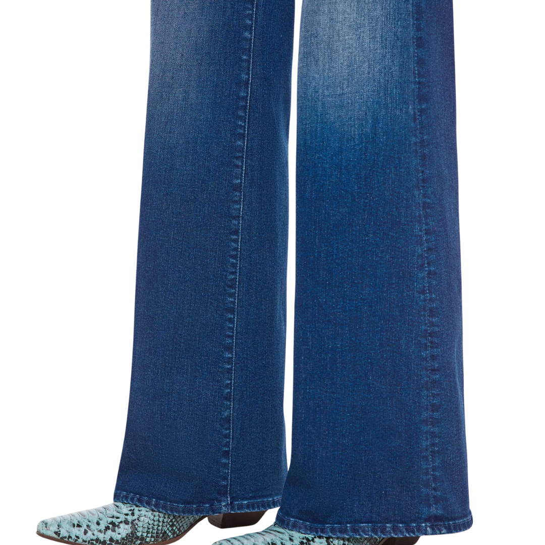 Up to no good. 70s-inspired wide leg jeans with a high rise, zip fly, 33.25-inch inseam and a clean hem. Made from a blend of recycled stretch denim, Troublemaker is a mid-blue with whiskering and fading at the knees.