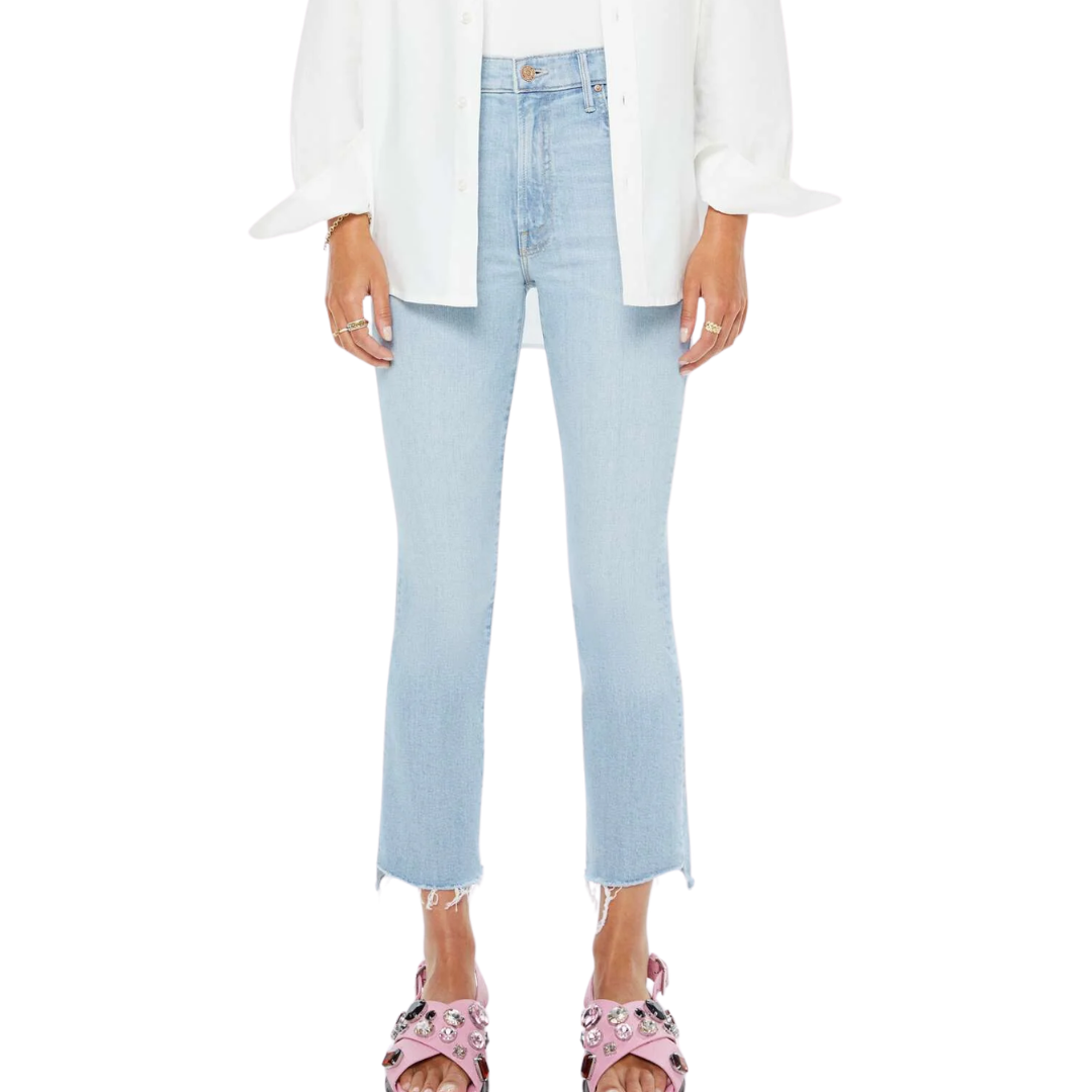 Chosen one. This iconic high-waisted bootcut is cropped at the ankle with a zip fly and a frayed step-hem. Made from denim with a touch of stretch, You're My Favorite is a light blue with subtle whiskering and fading at the knee. MOTHER's go-to.