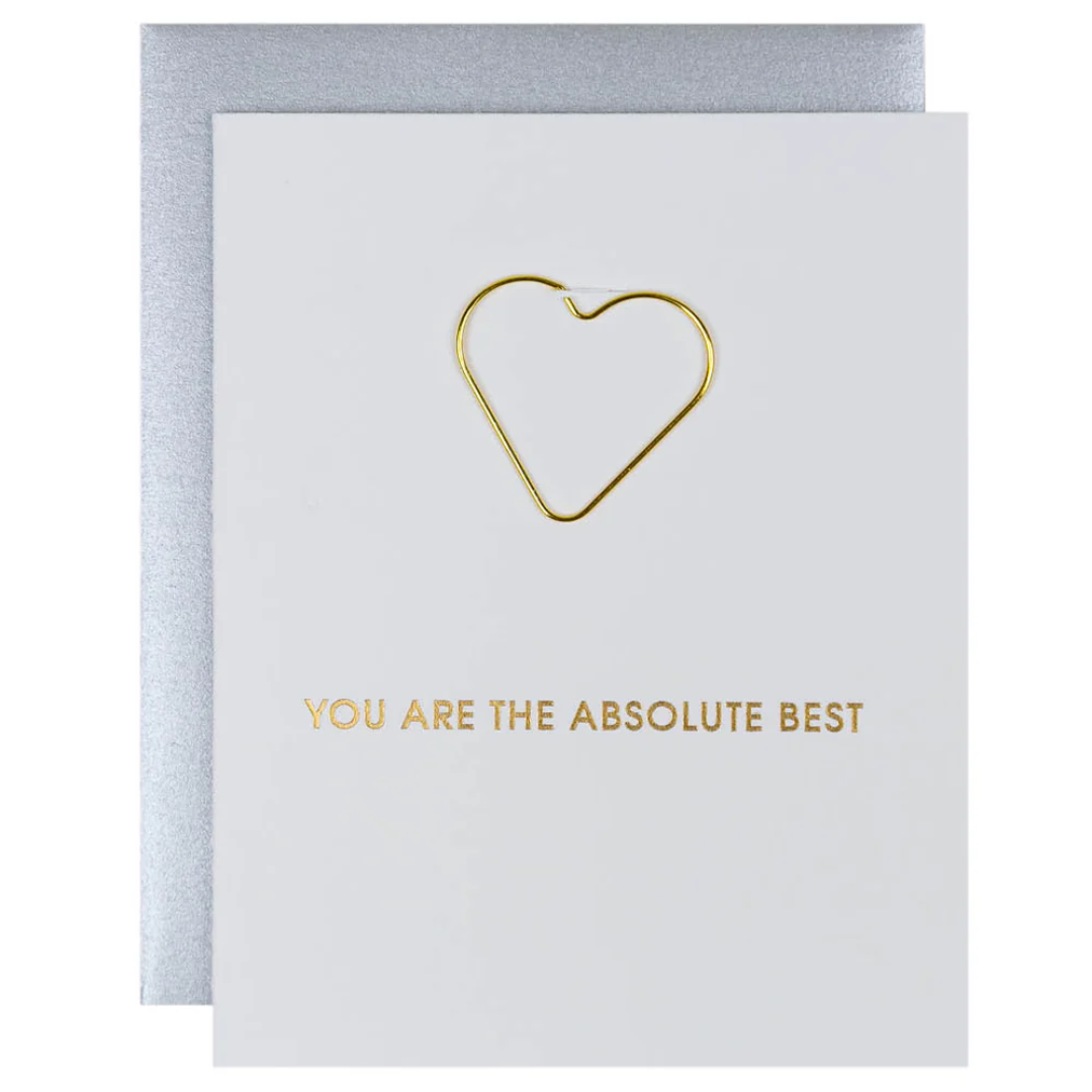 Our "You are the Absolute Best" card is letterpress printed on a vintage printing press in sunny California. Card includes a heavy duty heart paper clip.