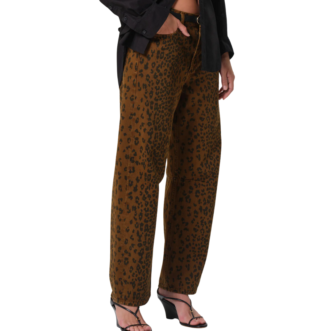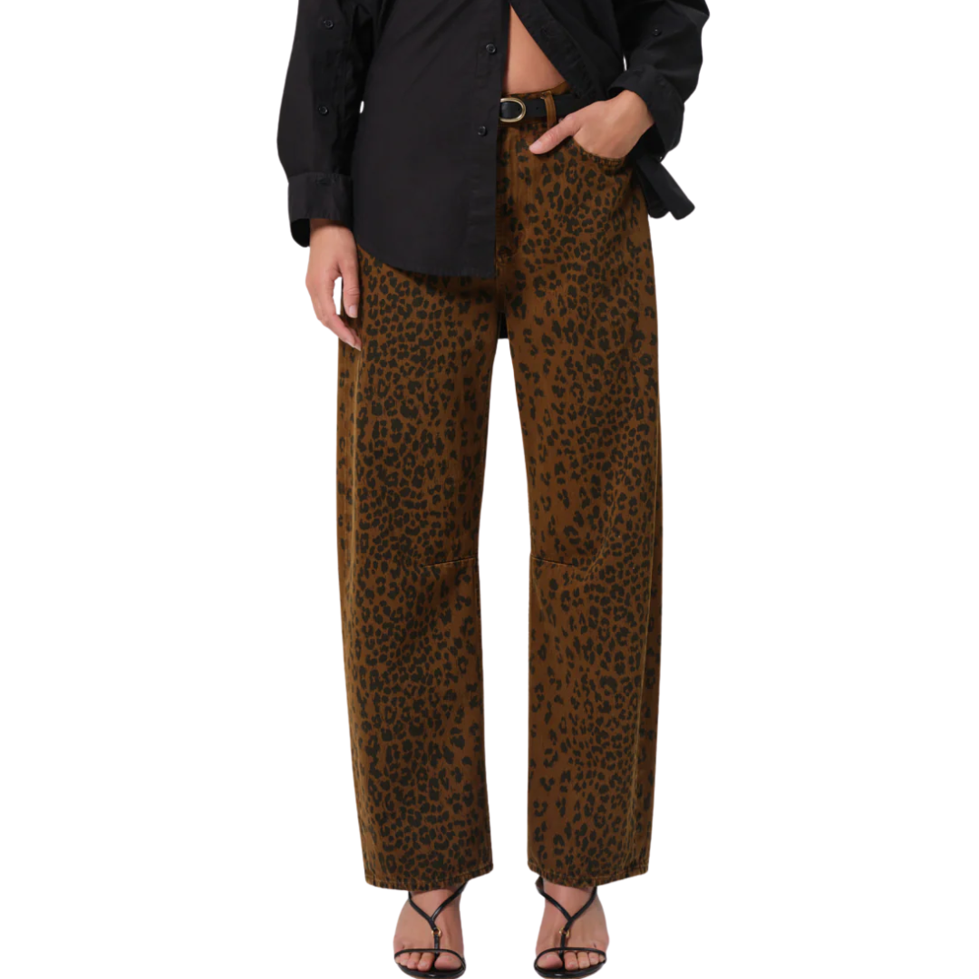 A low-slung relaxed jean crafted from rigid, non-stretch denim for a structured yet effortless feel. The silhouette tapers to the ankle, creating a clean, contemporary line. Dark brown denim with subtle black cheetah print detailing brings a refined, unexpected touch—perfect styled with minimal layers and sleek footwear for a polished, modern look.