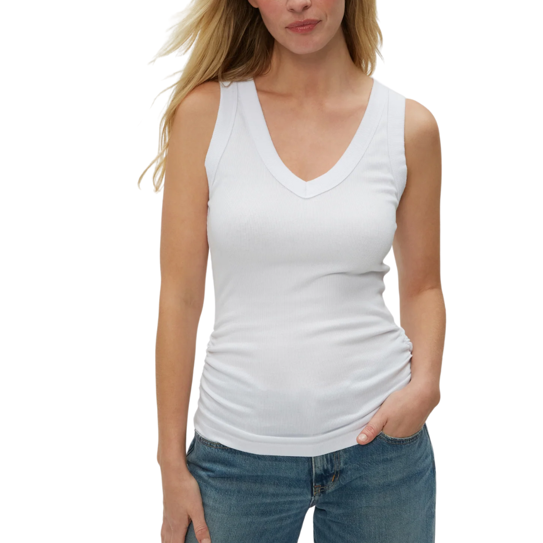 Fitted and sleeveless with a v-neck, Blanche is ribbed with wide binding and ruching at the waist. Made from our soft Ultra Rib fabric that washes well and keeps its shape throughout wearing.