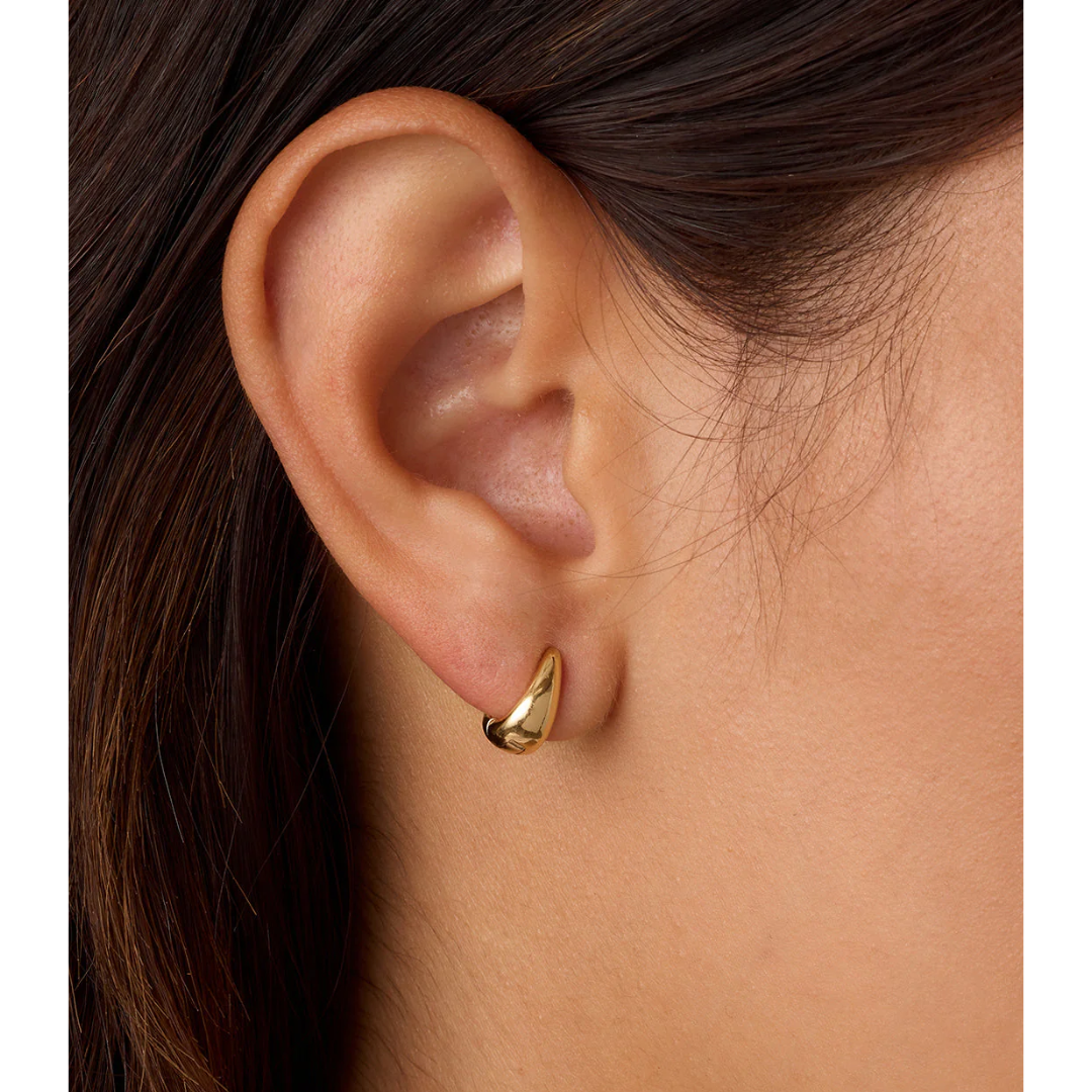 Designed to hug your earlobe, these 18k gold plated huggie earrings are your go-to for effortless stacking. Style your huggies with hoops and studs, or let them shine solo for a minimalist moment. Lightweight and versatile, they transition seamlessly from your morning coffee to a night out.