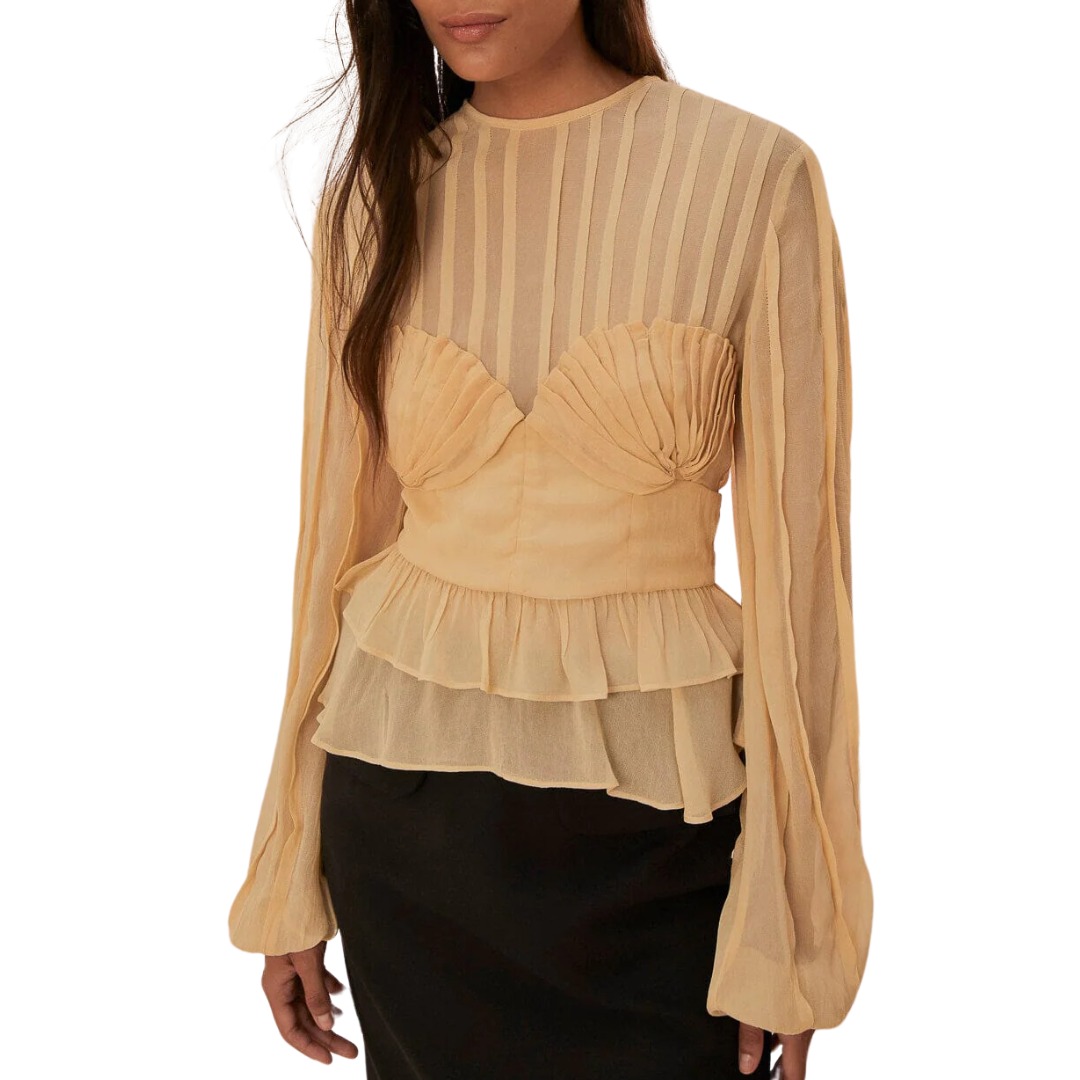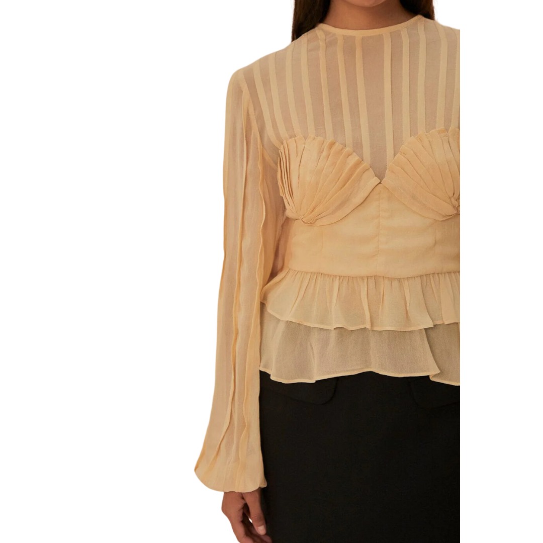 Embrace the unique charm of the Beige Pleated Bust Blouse, a delightful choice from FARM Rio. Featuring a textured, pleated bodice and a softly ruffled hem, this blouse exudes an air of effortless elegance with its beige tonal play. The high neckline adds sophistication, while the long sleeves and pleated details create a flattering silhouette. This piece brings a touch of Brazilian flair to your wardrobe, perfect for a graceful transition from day to night.