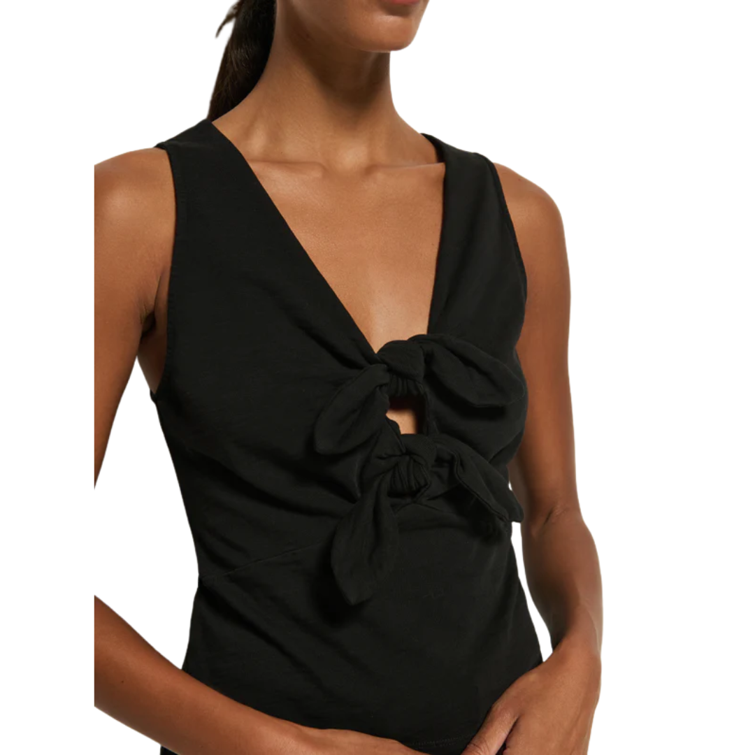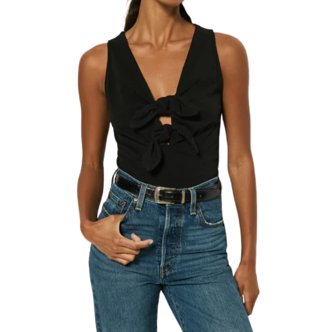 When your going-out top needs some refinement, the Terri Tie Tank has you covered. Made in easy cotton jersey, this form-fitting top features front bow-tie detailing, a flattering v-neckline, and side slit openings for utmost comfort. This one comes in Jet Black.