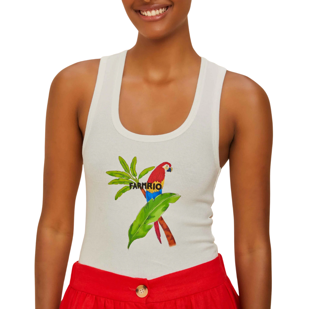 Embrace the vibrant charm of Brazilian nature with the off-white Farmrio macaw tank top. Featuring a playful embroidered macaw perched amidst lush greenery, this piece radiates joy and warmth. The round neckline enhances its soft, laid-back silhouette, perfect for sunlit adventures. Each detail exudes an inviting playfulness, effortlessly bringing a splash of color and creativity into your wardrobe. Let this top be your go-to for capturing tropical bliss.