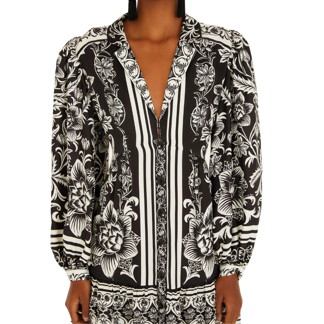 This mini dress features a printed design, long balloon sleeves, and a button up front. The dress is made by FARM RIO.