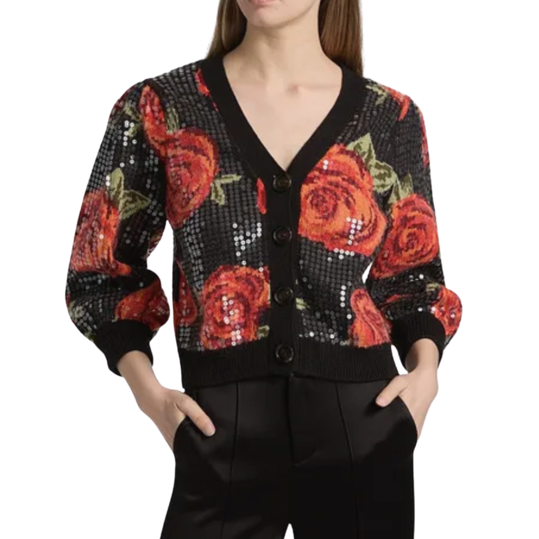 Farm Rio’s Women's Latin Roses Sequin Knit V-Neck Cardigan feels like a joyful celebration in textile form. Swathed in bold florals and sprinkled with twinkling sequins, this piece channels a romantic yet spirited vibe that’s classic Farm Rio. The V-neckline adds a touch of sophistication, while rib-knit trims keep it grounded. The cardigan's tactile blend of acrylic, polyamide, and wool wraps you in softness, with a hint of warmth and a wink of glamour.