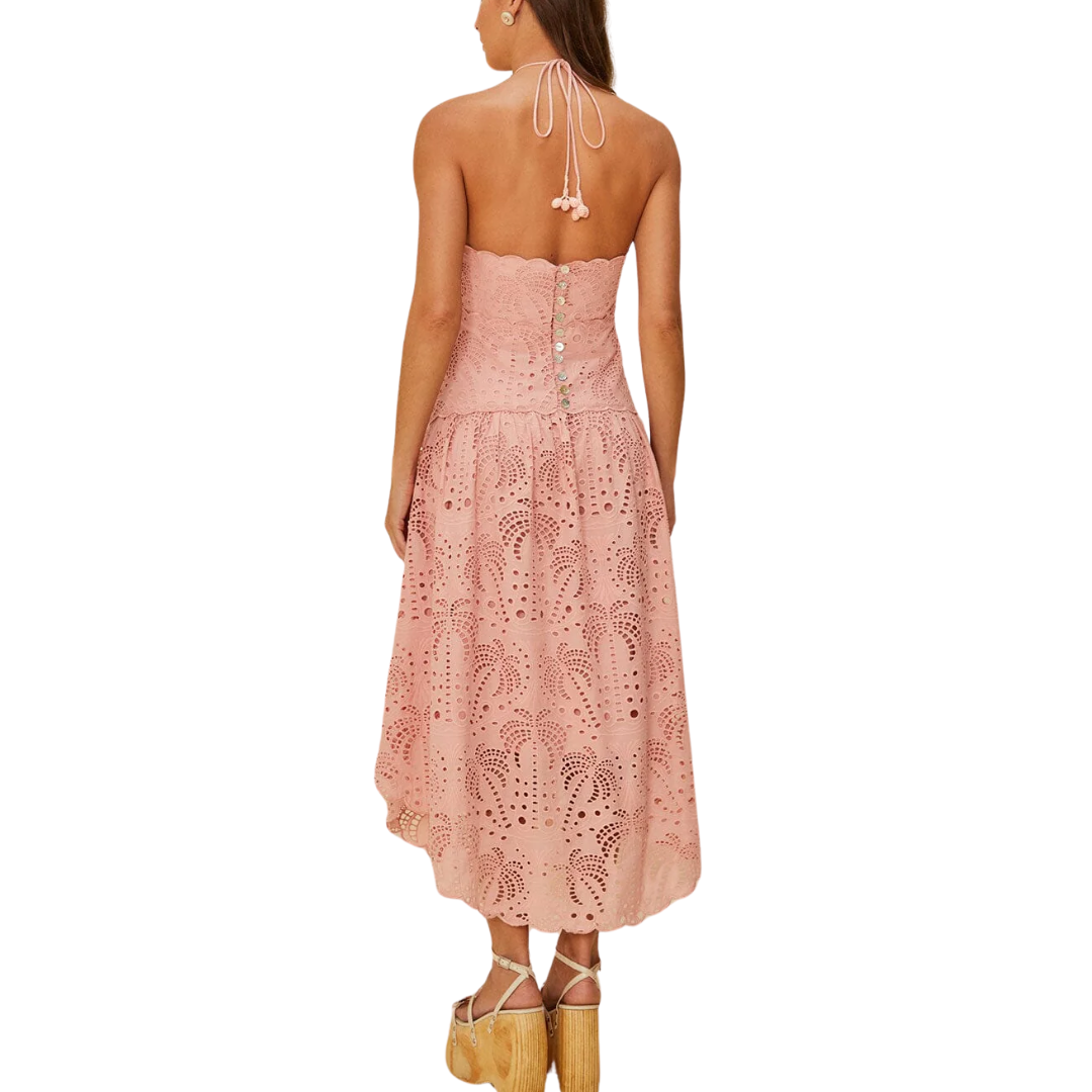 Embrace the playful elegance of the blush pink palm tree eyelet midi dress from FARM Rio. This enchanting piece features a halter neckline, gracefully highlighting the shoulders. The intricate eyelet fabric is adorned with whimsical palm tree motifs, capturing the essence of tropical charm. Its flowing midi silhouette and scalloped hem add a touch of breezy sophistication. Perfect for sunlit strolls and joyful gatherings, this dress is pure delight.