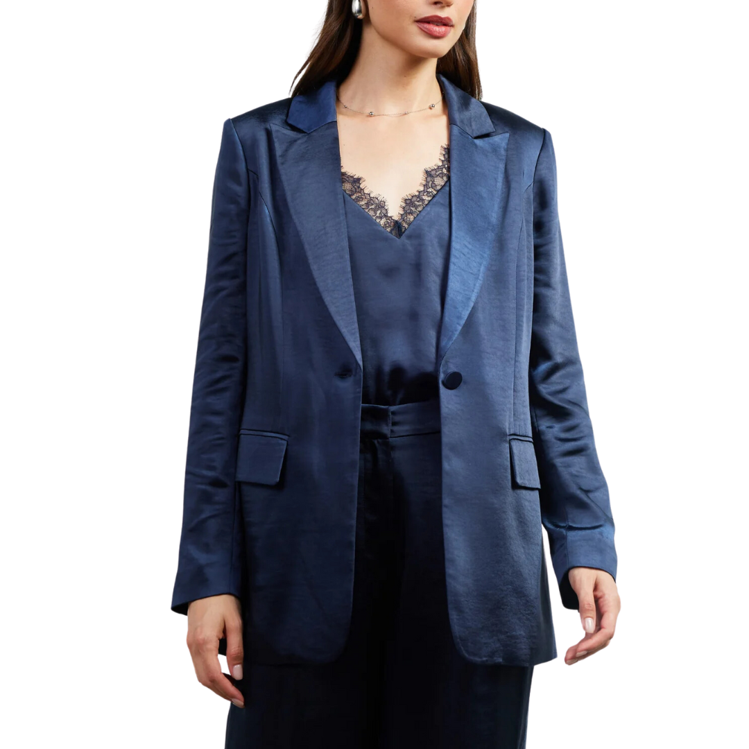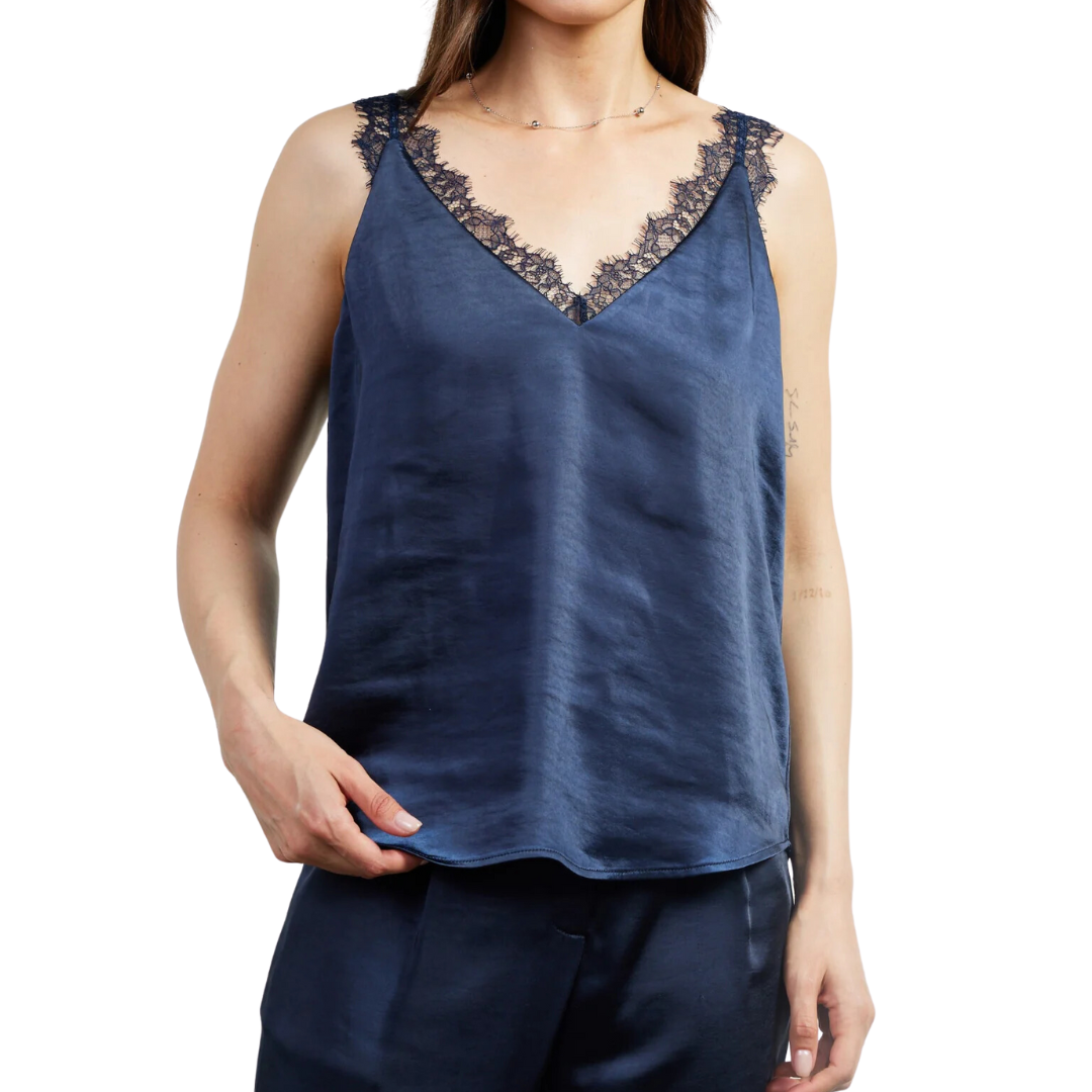 Satin cami with lace detailing. Pair with matching satin blazer.