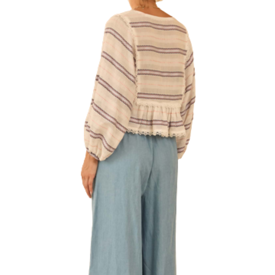 Your new go-to top for spring! Featuring peplum detailing with multi colored stripes.