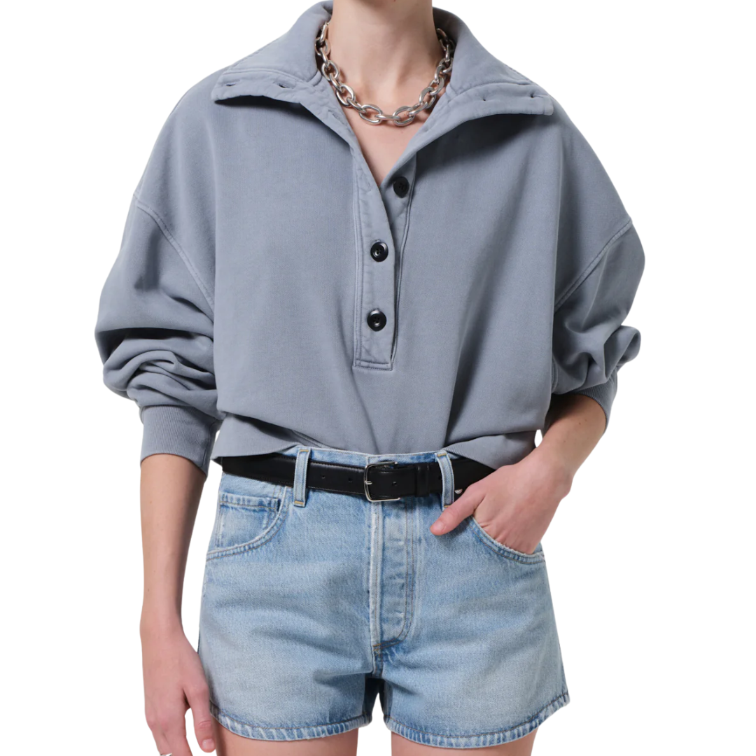Elevate your sweatshirt game with the Mirelle Pullover, which features a deep button-down closure, soft collar, long raglan sleeves, and a relaxed fit for all-day comfort—ideal for layering or pairing with denim shorting.