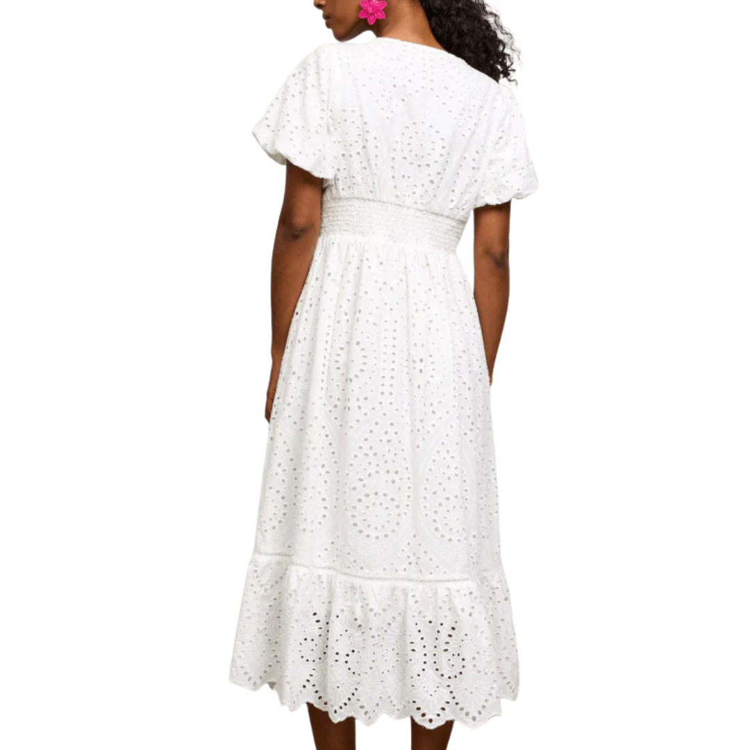 EYELET SMOCKED BACK MIDI DRESS WHITE