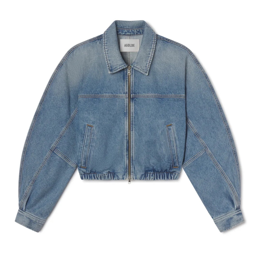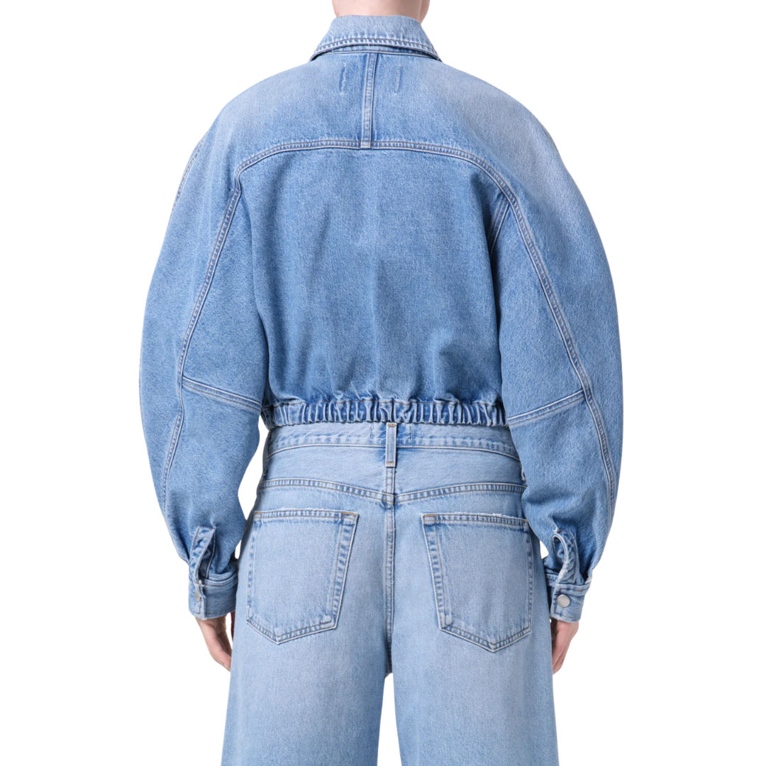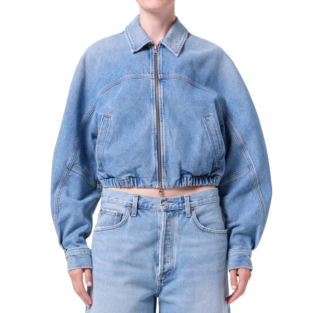 AGOLDE Dixon Cocoon Bomber in Outbreak. The Dixon Cocoon Bomber reimagines denim with a sculptural, relaxed silhouette. Designed in a medium vintage indigo wash, it features a zip front closure, pointed collar, and an elasticated hem that creates soft volume through the shape. Crafted from non-stretch cotton denim with a soft hand feel, it combines durability with all day comfort and effortless wearability.