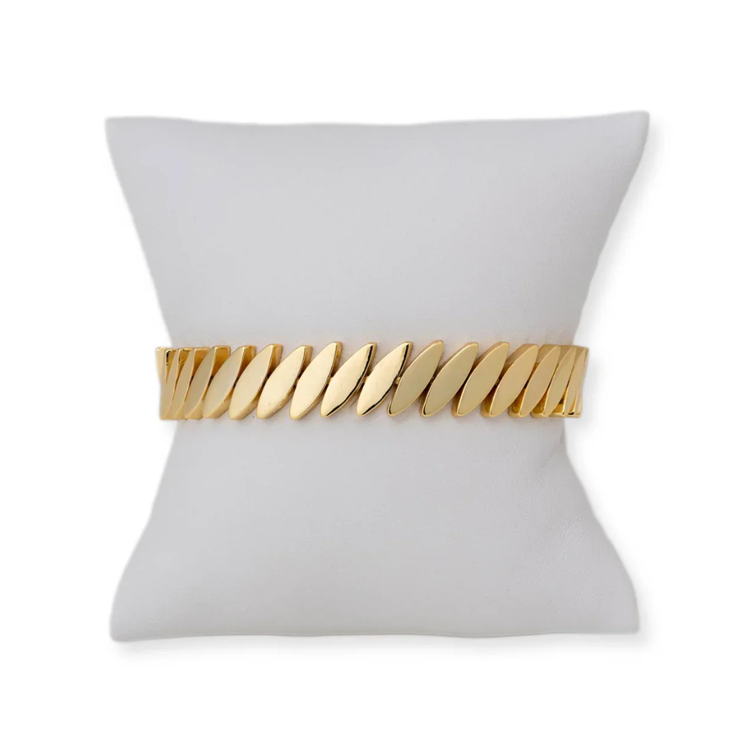 The perfect accessory for any stylish outfit. This golden, sleek design adds a touch of elegance and can be worn on its own or layered with other Bracha bracelets for a personalized look. Elevate your fashion game with this must-have piece.