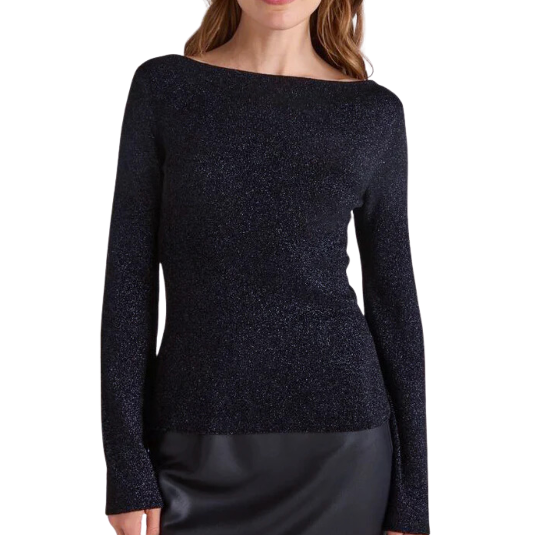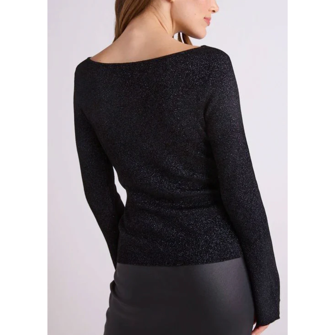 The Bella Dahl Boatneck L/S Sweater in Black Metallic is the perfect addition to any event or party look. The boat neck and metallic accents add a touch of sparkle to this classic black sweater. Elevate your style with our expertly crafted design.