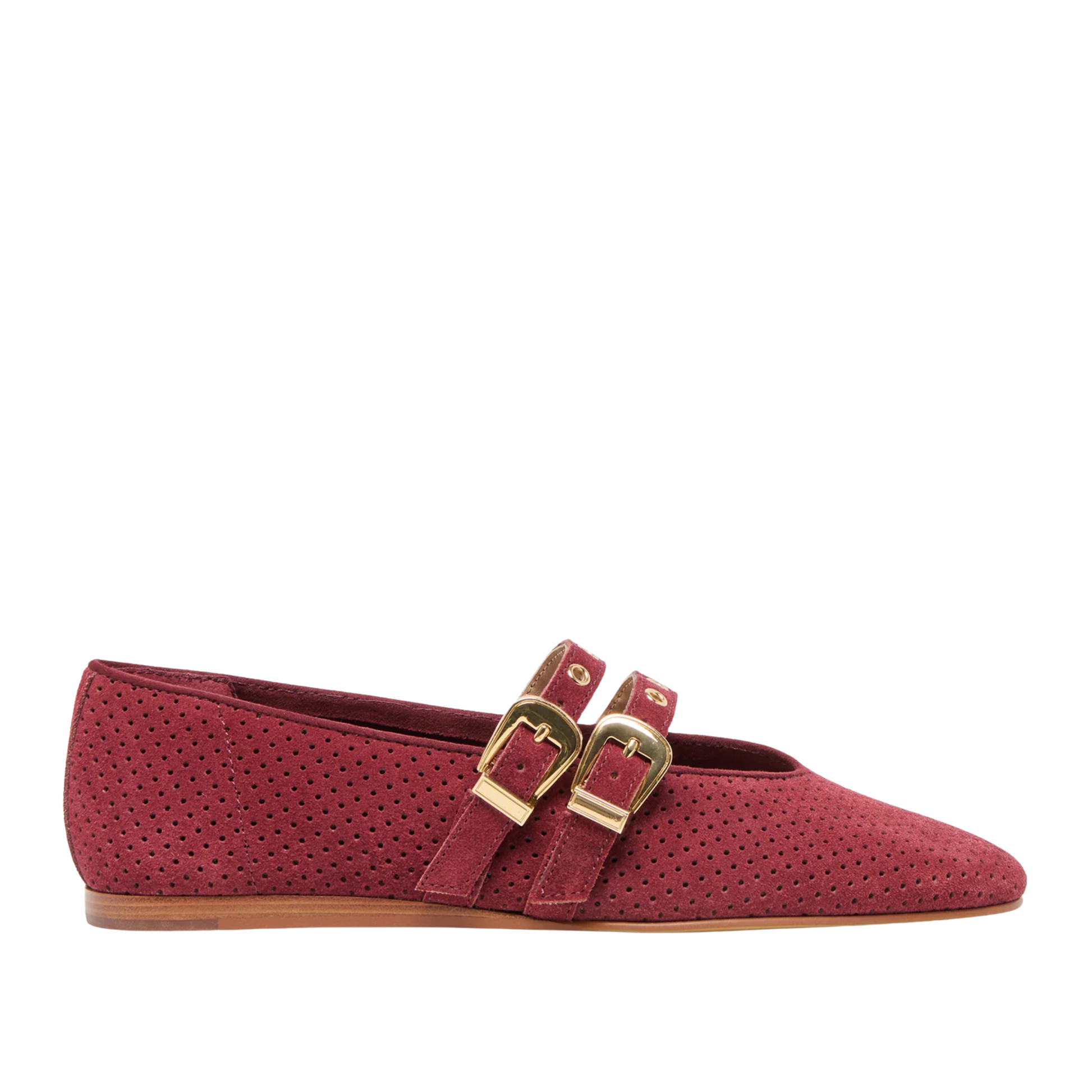 BAYLEE GROMMET makes a statement out of her double strap mary-jane design with gold metal grommets and bold buckles. This sustainably-crafted flat boasts sustainable materials and a bevy of colorways in perforated or printed suede for one on-trend and versatile ballet flat.