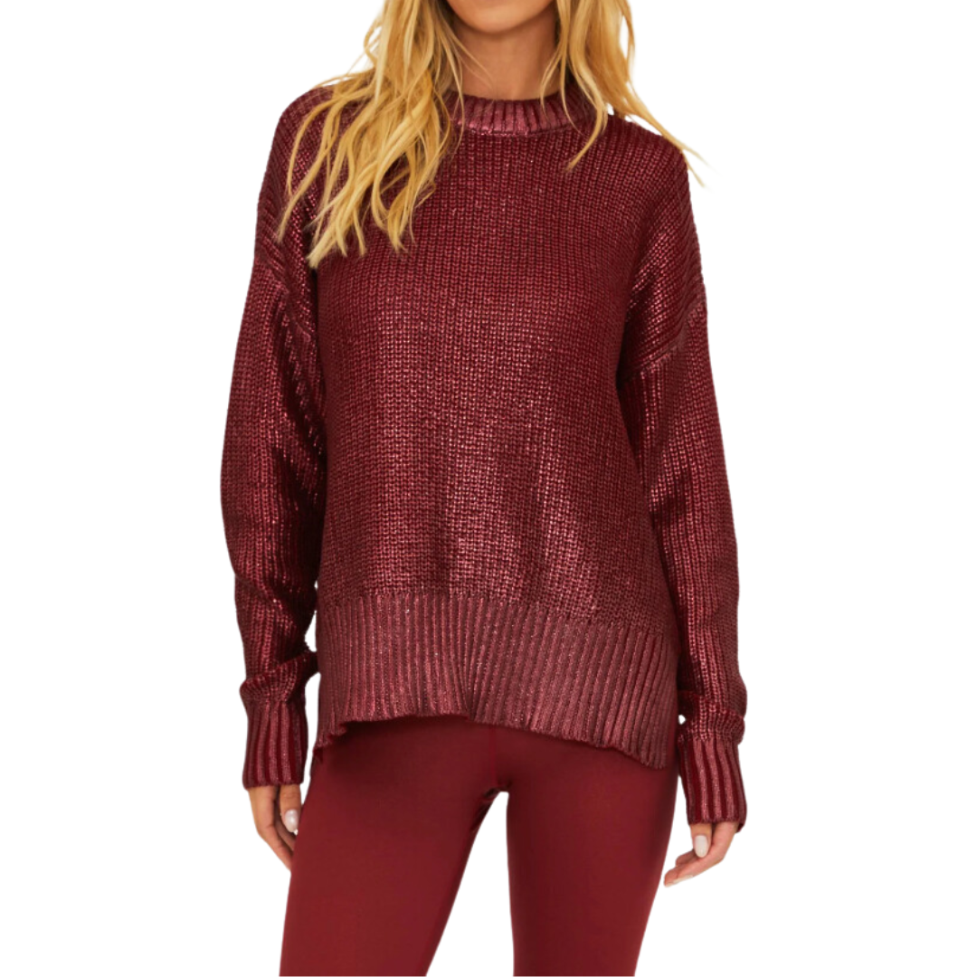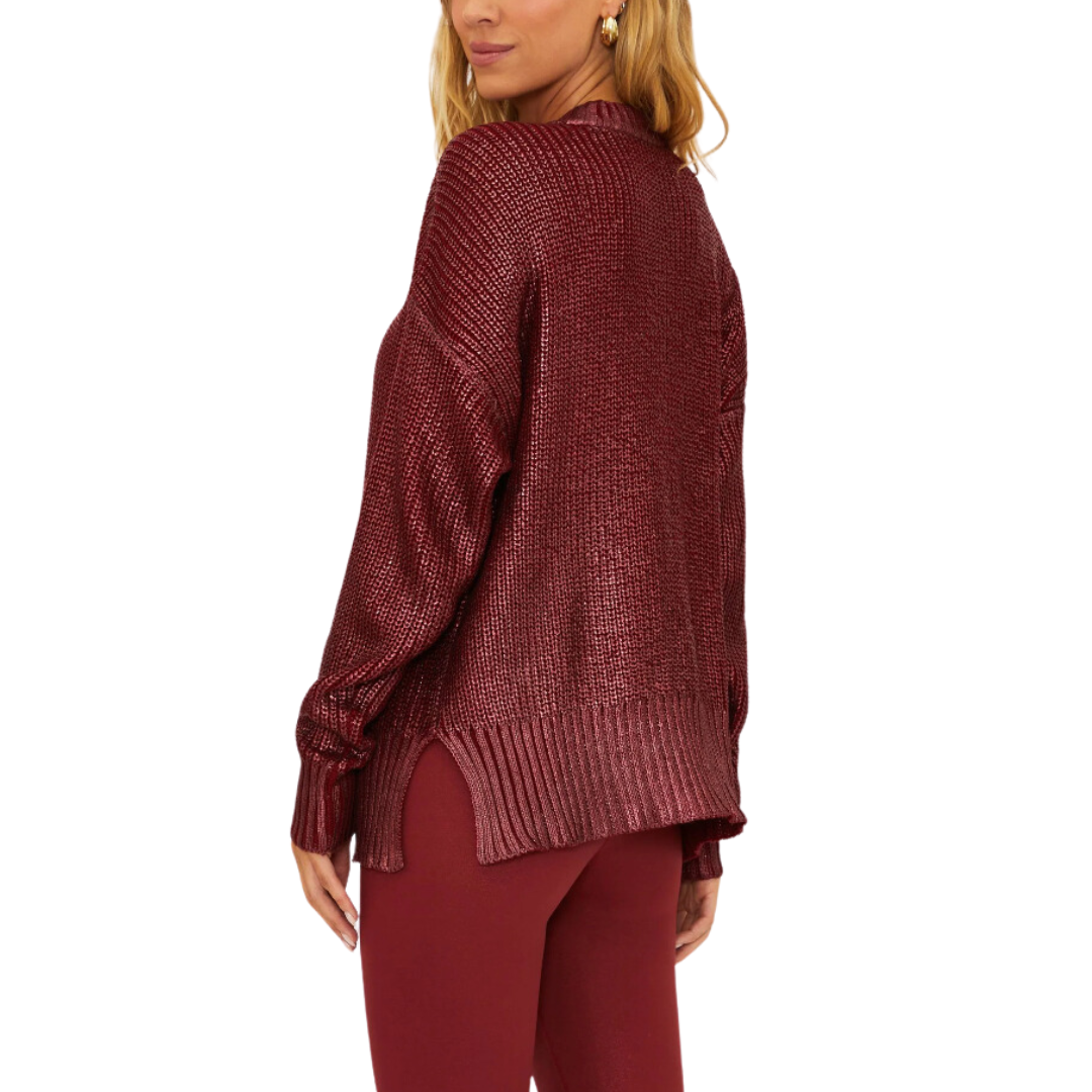 The Callie Sweater is our oversized, crew neck sweater featured in an iridescent merlot red, midweight coated knit fabric with ribbed cuffs, dropped shoulder sleeves, and side slits. This fun sweater can be paired with the Piper Legging in Merlot Shimmer or styled with your favorite pair of jeans. This sweater runs large and is intended to have an oversized fit. Size down if you prefer a more fitted look.