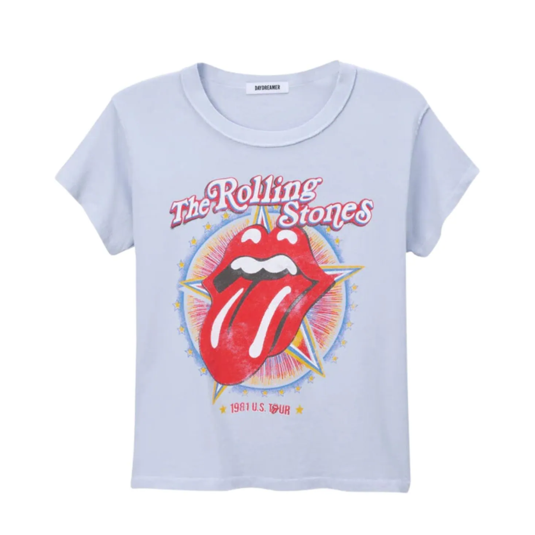 DAYDREAMER Rolling Stones US 1981 Tour Tee in Lavender Sky Reverse Girlfriend Tee. Let the music legends take you back in time with this one-of-a-kind Rolling Stones 1981 US Tour Reverse Girlfriend Tee. Featuring the famous tongue logo on the front, you’ll feel like you’re following the band across the U.S. all over again. For Stones fans and vintage tee collectors, this is the perfect top to add to your wardrobe rotation.Strike up a conversation with a fellow fan in this soft cotton T-shirt featuring perfectly faded graphics inspired by one of the band’s most iconic albums.