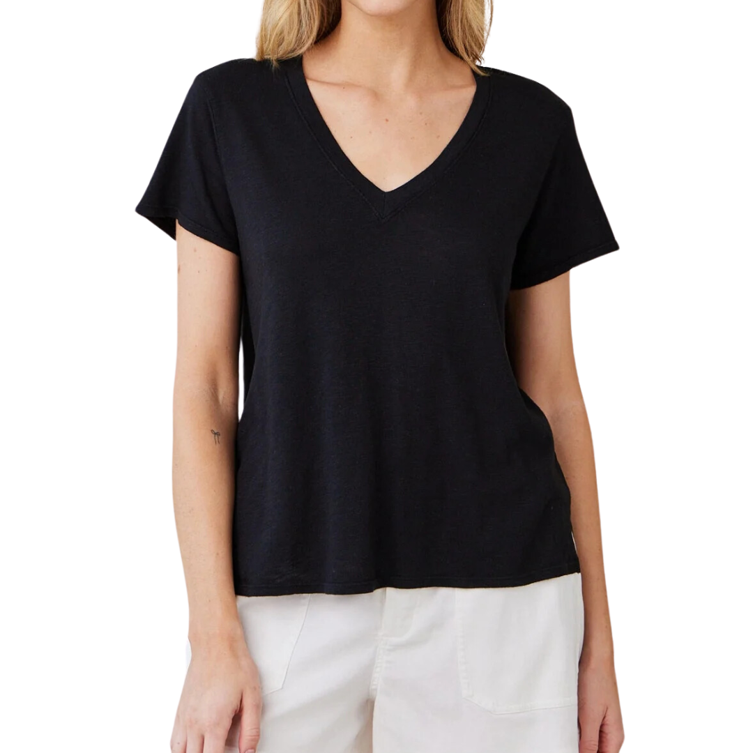 This classic tee features a flattering V-neckline with side slits, adding a touch of sophistication to your everyday look. With its short sleeves, this tee is perfect for layering under your favorite cardigan. 50% Rayon, 50% Slub cotton.