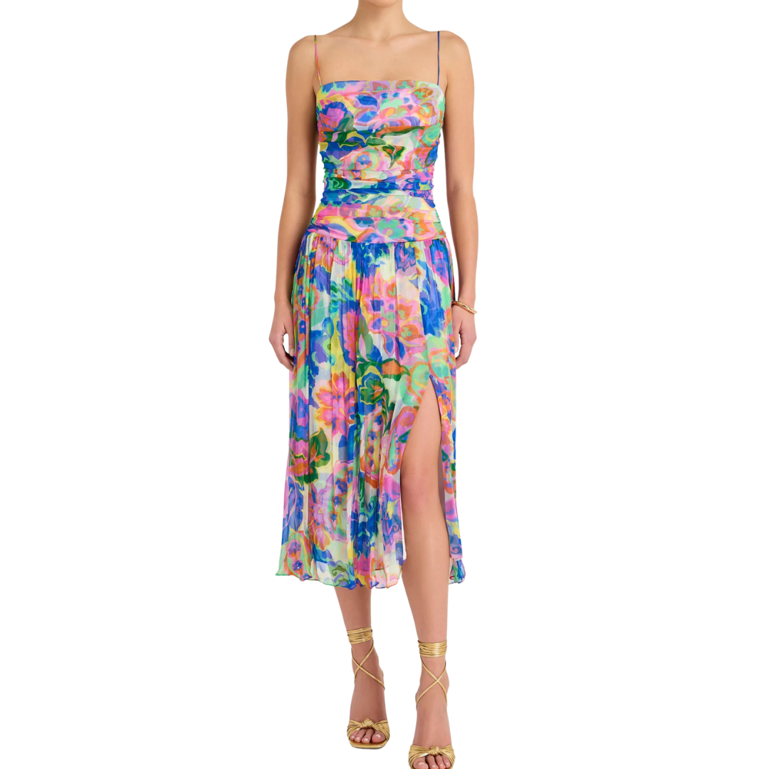 Steal the spotlight in the Lumiere Dress. Featuring flattering gathering on the bodice and a gathered skirt that opens with a gentle slit, this expressive and festive midi is the perfect choice for memorable evenings. Style with strappy sandals and gold jewelry and get ready to turn heads.