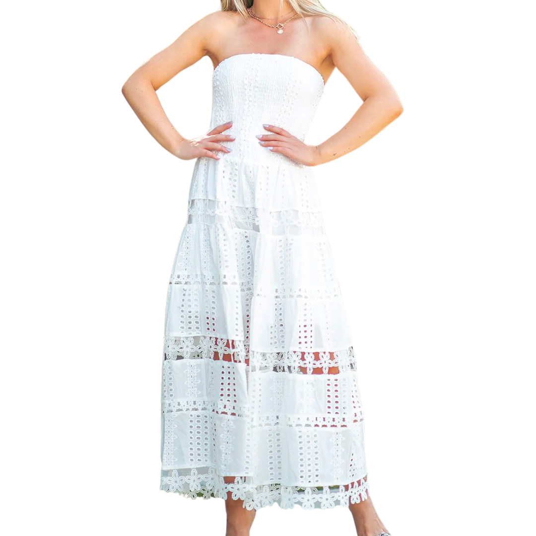 This midi dress features eyelet lace detailing and comes in white. From stylish office days to nights out with friends, this timeless piece will take you from day to night while keeping you comfortable and stylish.
