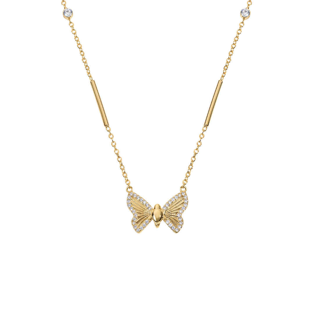 The perfect symbol of your free-spirit and grace. The Fly Away Necklace features a unique chain and feminine butterfly charm that stand out on their own or in a necklace stack.