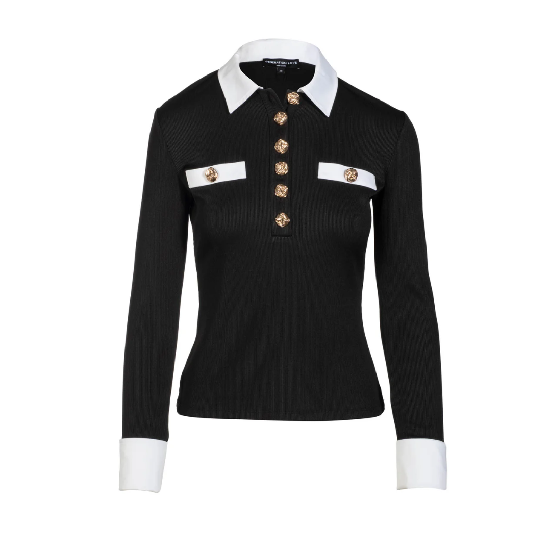 Classic and timeless, this fine rib top features contrast poplin details and gold knot buttons for a striking finish. An essential for fall, it pairs effortlessly with tailored trousers, sleek skirts, or casual denim for polished looks.