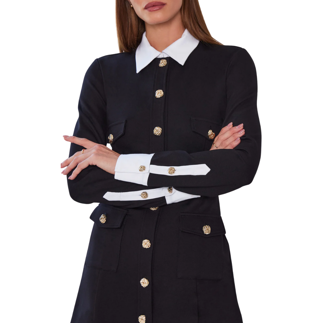This chic dress blends tailored polish with a captivating mini silhouette. Crisp contrast poplin at the collar and cuffs, along with refined gold knot buttons, deliver a striking finish. Ideal for office hours and evenings out, it's an essential for your wardrobe.