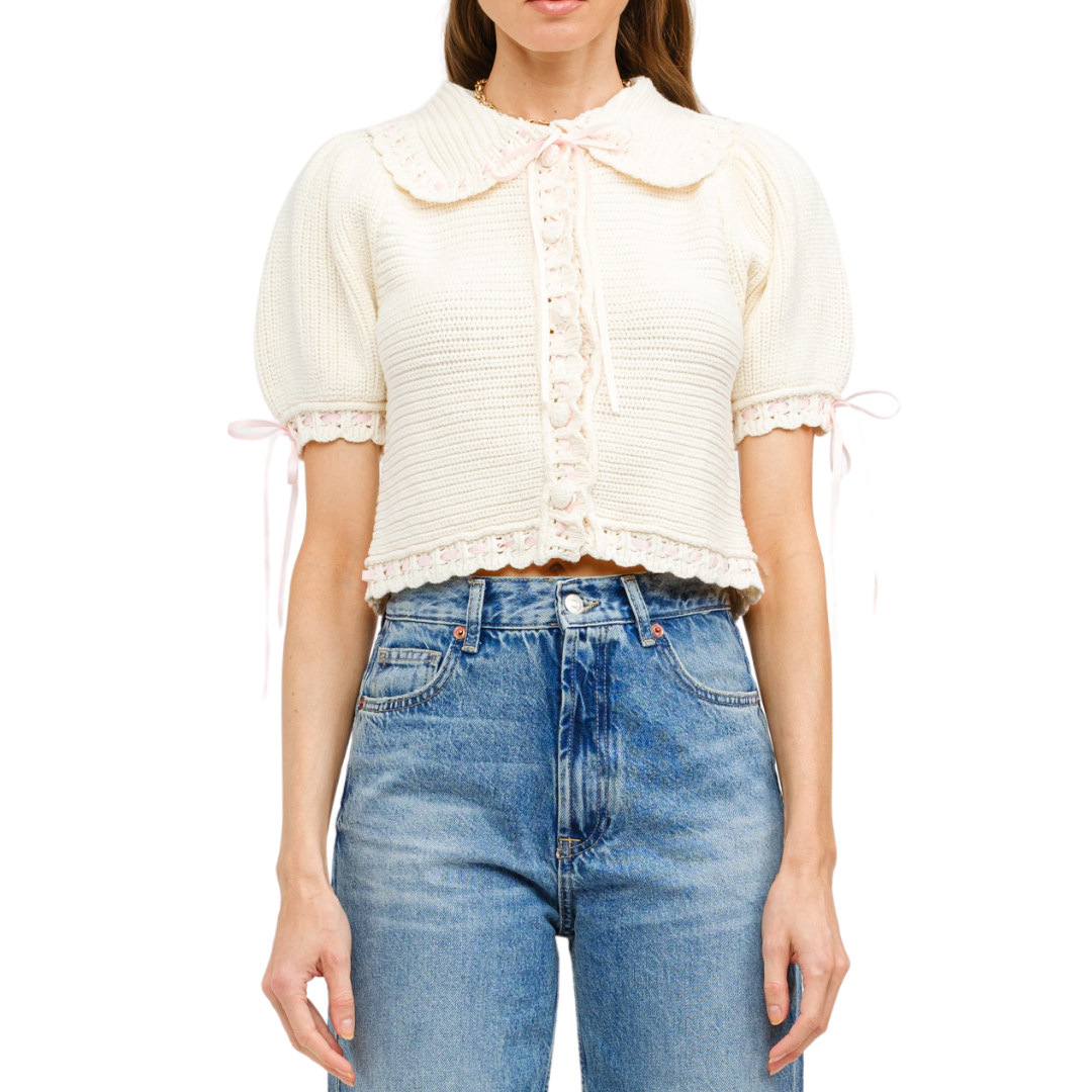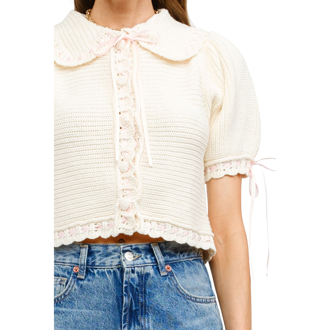 Knitted button down sweater with pink ribbon detailing