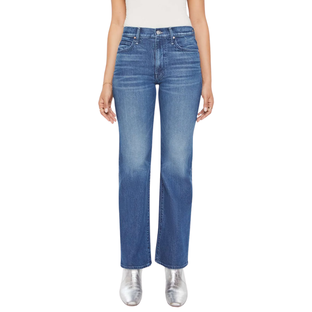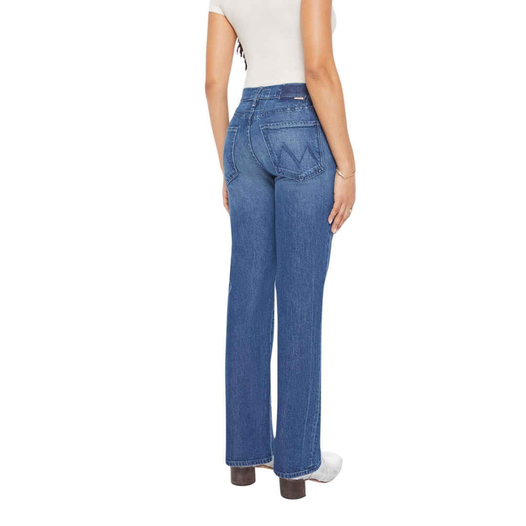 A high-rise straight leg jean with a zip fly, long 30-inch inseam and a clean hem. Made from semi-rigid SUPERIOR denim, Which Is Witch is a mid-blue with whiskering and fading at the knees.