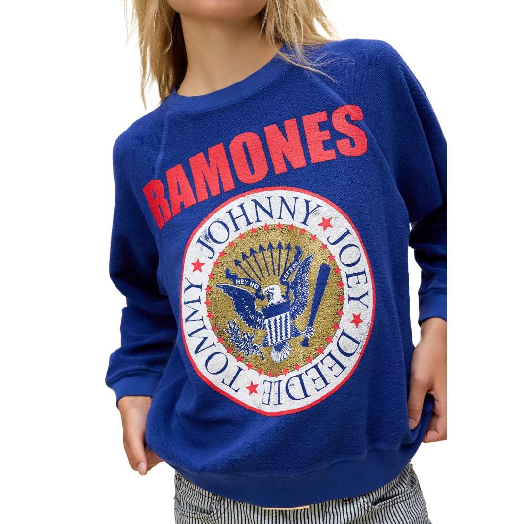 The Ramones straight delivered high-energy excitement into rock and roll. The group’s iconic, classic seal featuring an eagle graphic and the main member’s names lands center on this Reverse Raglan Sweatshirt accented in bold colors and gold metallic ink to really pack a punch.