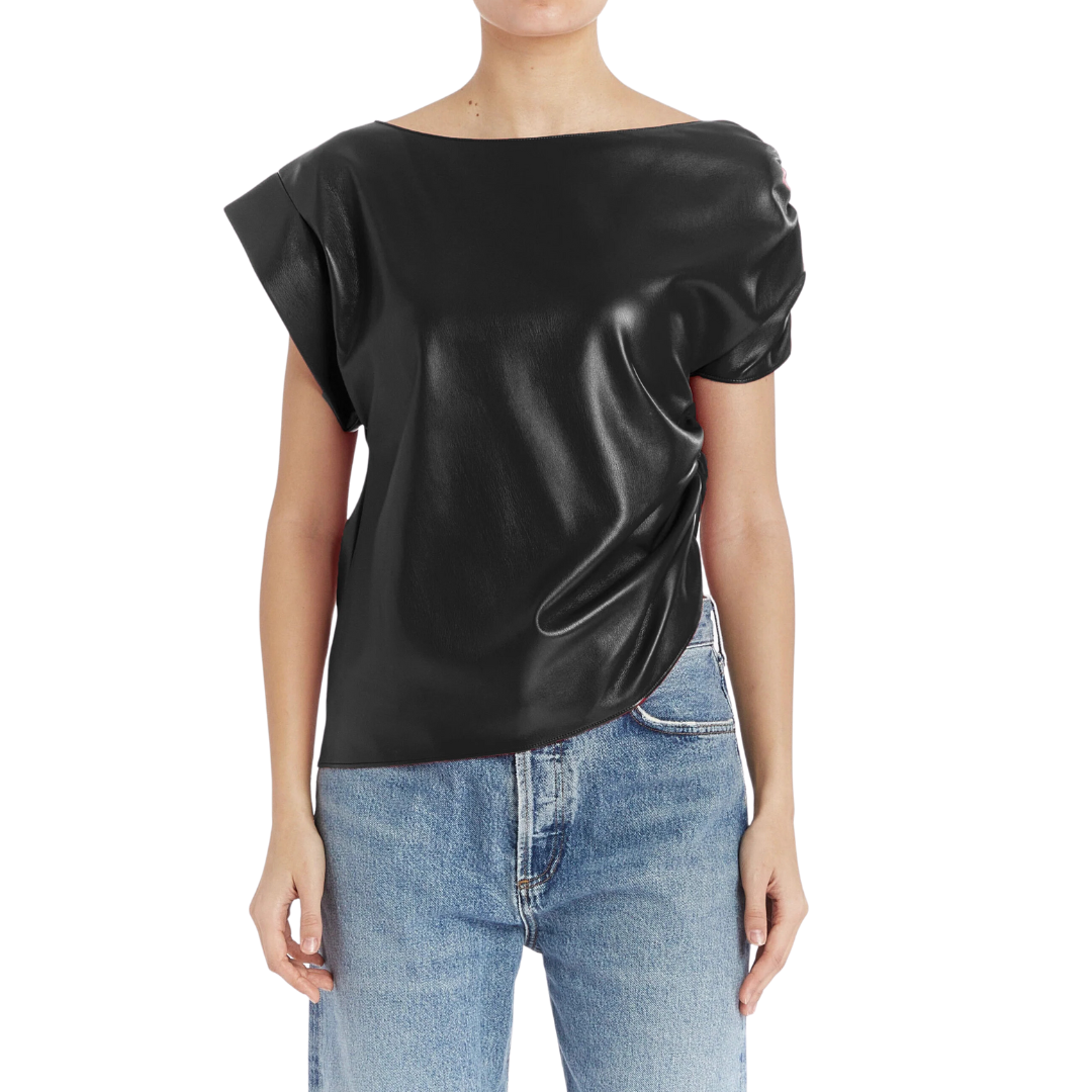 Effortlessly elevate any outfit with the Amanda Uprichard Elroy Faux Leather Top. Featuring short sleeves and ruching at the shoulder and side, this vegan leather top adds a touch of edgy sophistication to your wardrobe. Make a bold statement with this must-have piece!
