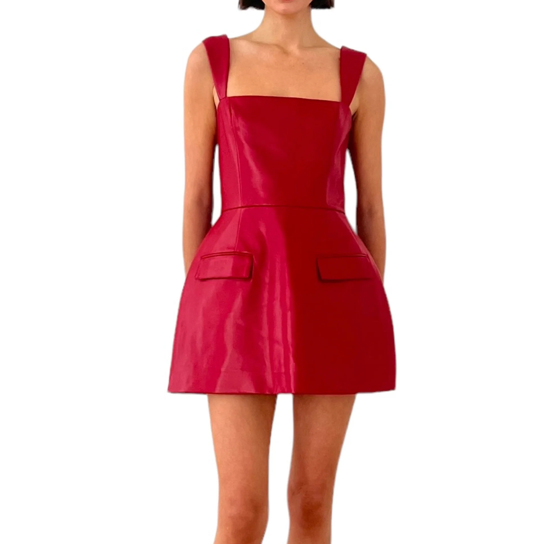 The Bethany Romper in Scarlet Red faux leather features a-line neck, round sculpted skirt, wide straps with sliders, pocket flaps, and invisible zipper. The perfect holiday mini dress.