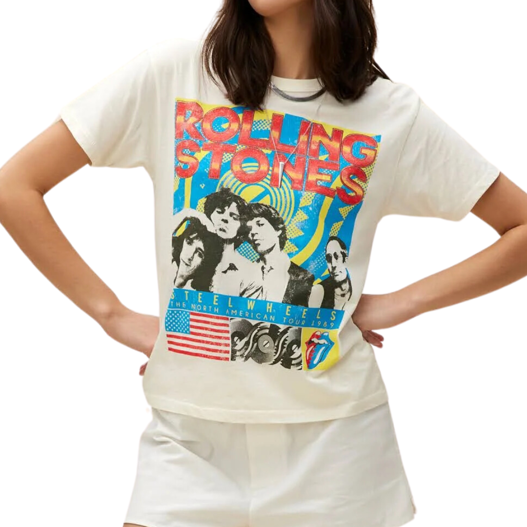 The release of “Steel Wheels” was a major comeback for the crew, prompting the Rolling Stones’ 1989 North American tour. A rendition of the album’s artwork featuring rolling records alongside the Stones’ hot lips logo hits this double-sided tee. Designed like an authentic flier with a photo of the members and their Queens sold out show details, collaged with an American flag and NY skyline.