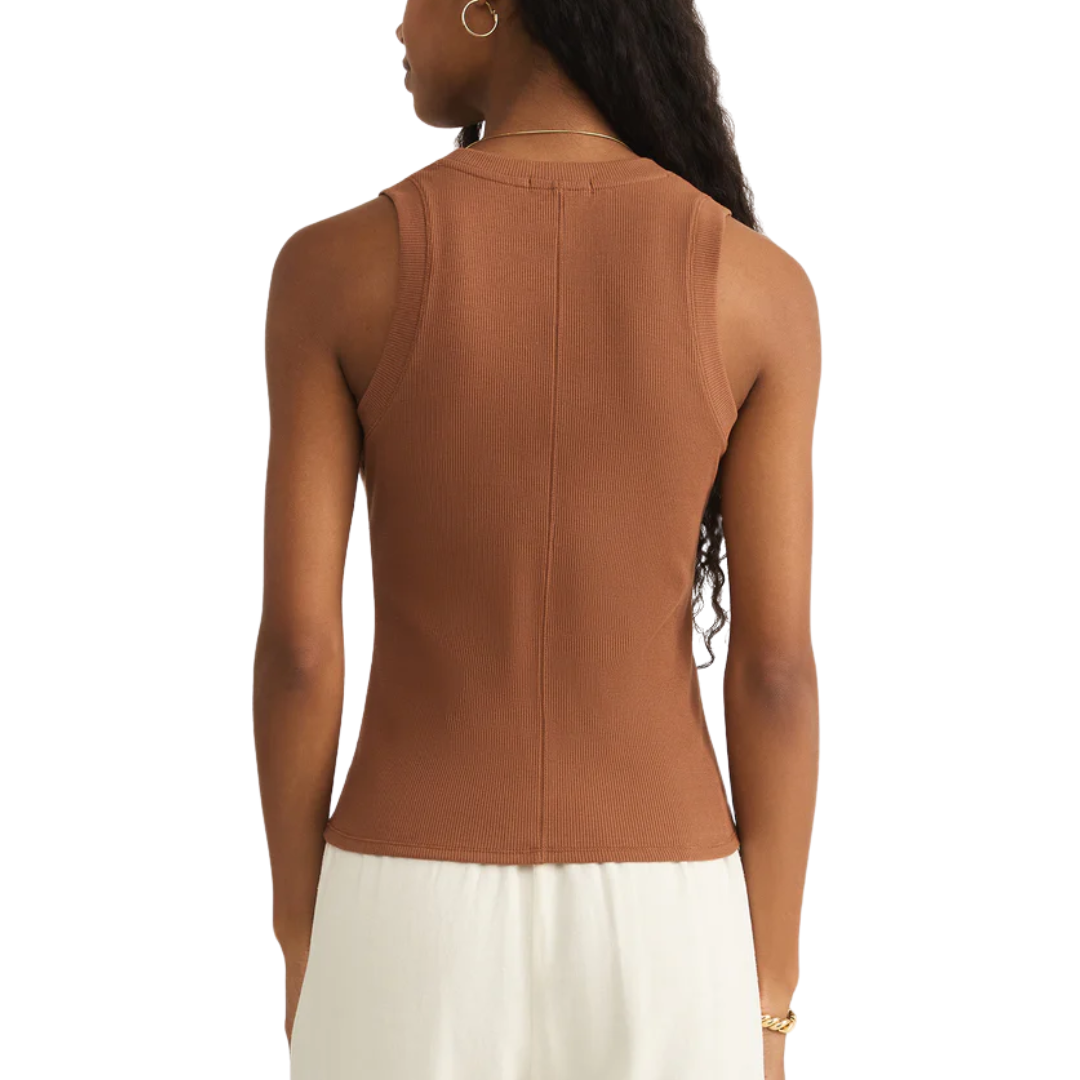 One of our most popular Essential tanks, made of our softly textured feather rib fabric, is a must-have whether worn on its own or as a fitted layer. We love this basic bra-friendly tank tucked or untucked.