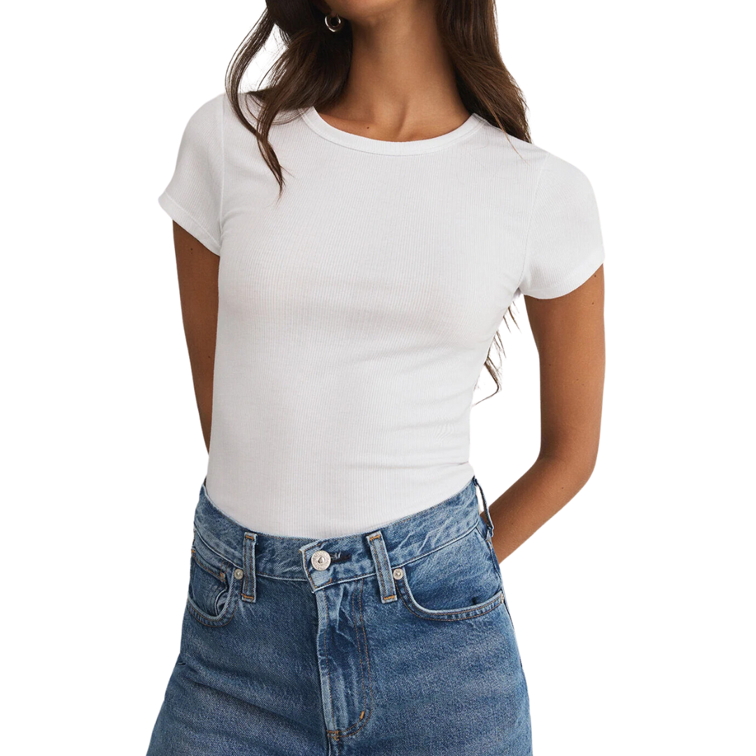 This classic ribbed tee is an essential for any wardrobe, with a comfy crew neckline and a flattering, somewhat fitted design that adds just the right touch of polish. Perfect for layering or wearing solo, this versatile piece can be tucked for a sleek look or worn loose for laid-back days, all season long.