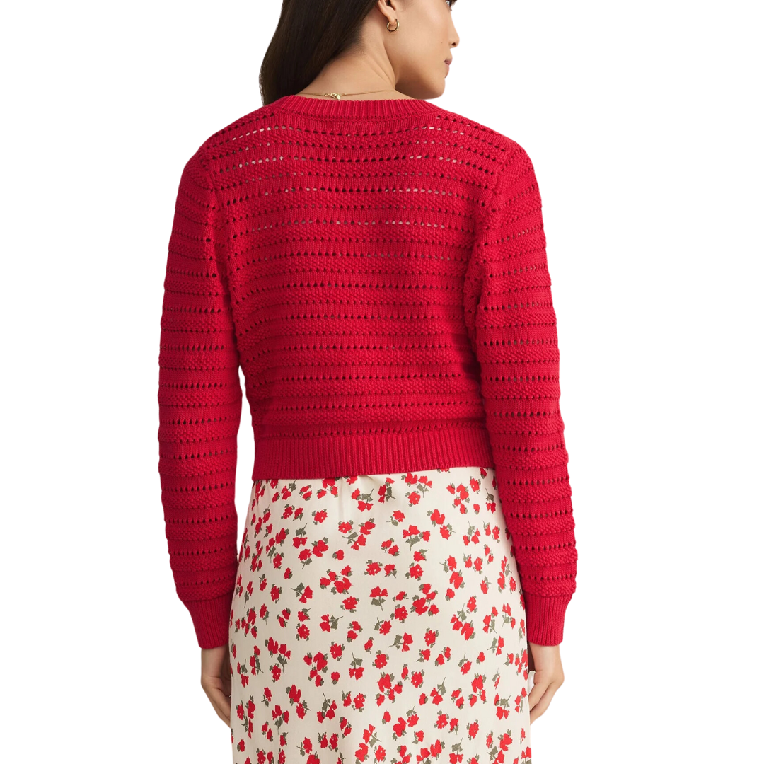 This airy, button-up sweater with a unique open-stitch pattern features ribbed details and a fitted bottom band for a flattering finish. Lightweight yet cozy, it’s an easy layer for transitioning seasons.