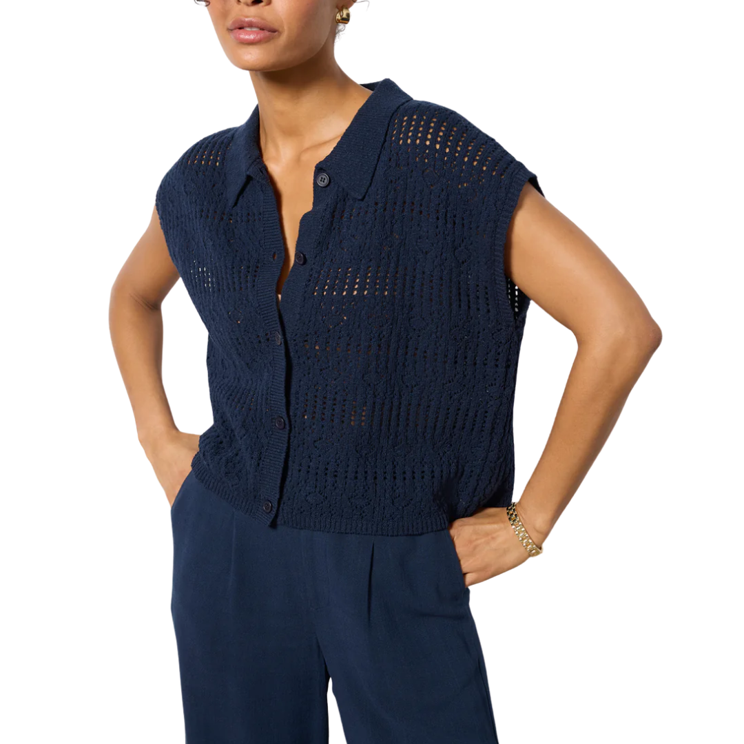 Crafted from twisted cotton slub yarns with a structured, open-knit feel, this sleeveless top features a collared neckline and button-up design. Engineered with a crochet-inspired pattern and drop shoulder, it’s textural, breathable, and designed with a modern, structured silhouette.